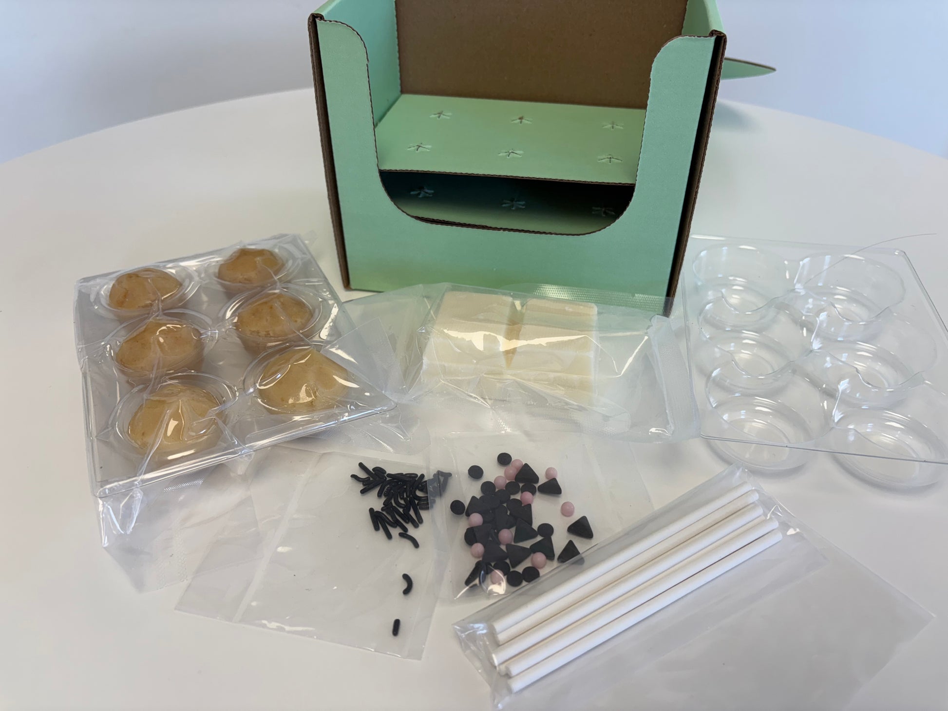 Includes: 6 vanilla cake balls, vanilla melting chocolate, dipping tray, cake pop sticks, black circle eyes, pink nose, black jimmies, black triangle ears, cake pop stand, and instructions.